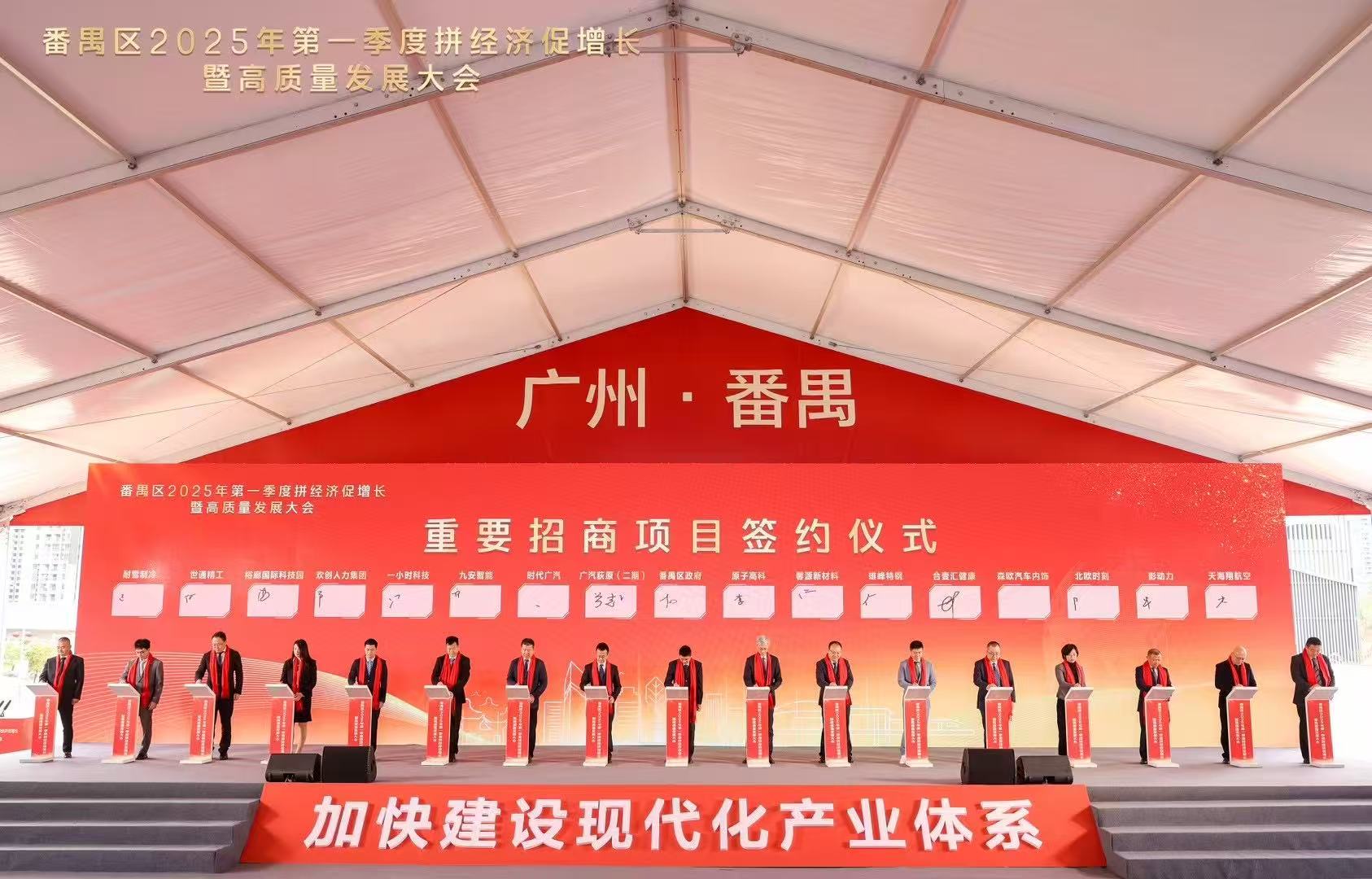 珠江潮湧千帆競,春風浩蕩萬象新。2月7日,番禺區2025年第一季度拼經濟促增長暨高質量發展大會召開,會議由番禺區委副書記、區長葉珊瑚主持,來自番禺區領導班子、各單位主要負責同志、民主黨派負責人、鎮街黨政領導、企業經營者代表、各行業及商會代表,以及高校和産(chǎn)業經濟領域的專家學者等300餘位嘉賓(bīn)齊聚一堂,共謀發展大計。會上舉行第一季度重點項目動工、竣工、投産(chǎn)儀式。包括歡創集團總部大廈項目在内的14個項目正式啓動,總投資額達78億元,項目達産(chǎn)後可實現年産(chǎn)值157億元,年稅收7.1億元,開年即展現番禺區奮勇當先、大幹實幹的奮進姿态,力争以第一季度“開門紅”引領高質量發展“全年勝”!
